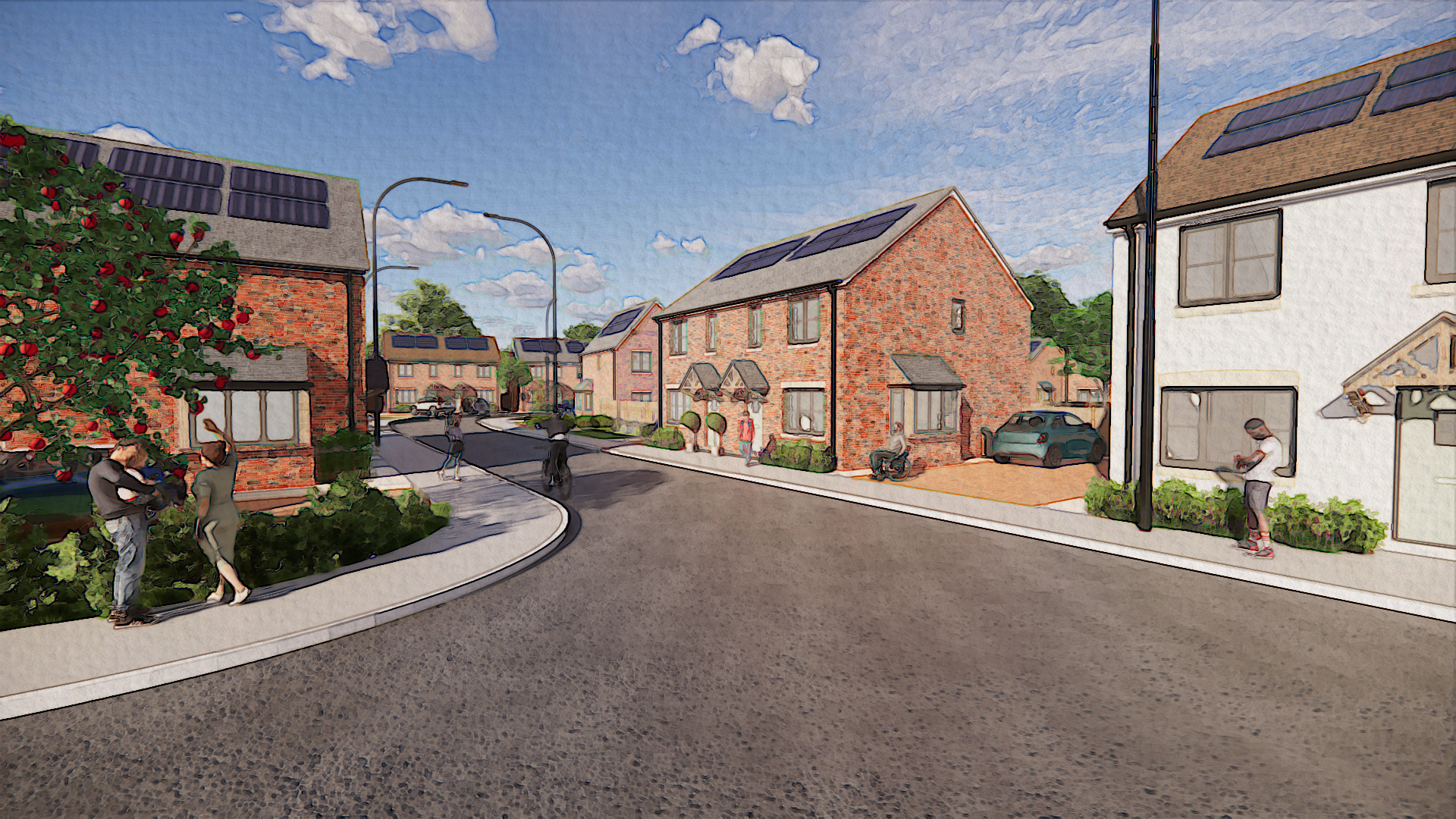 The 54 new homes at Marcher Way, Leominster, are built with sustainability in mind. The homes feature Air Source Heat Pumps, PV panels, and EV charging points.